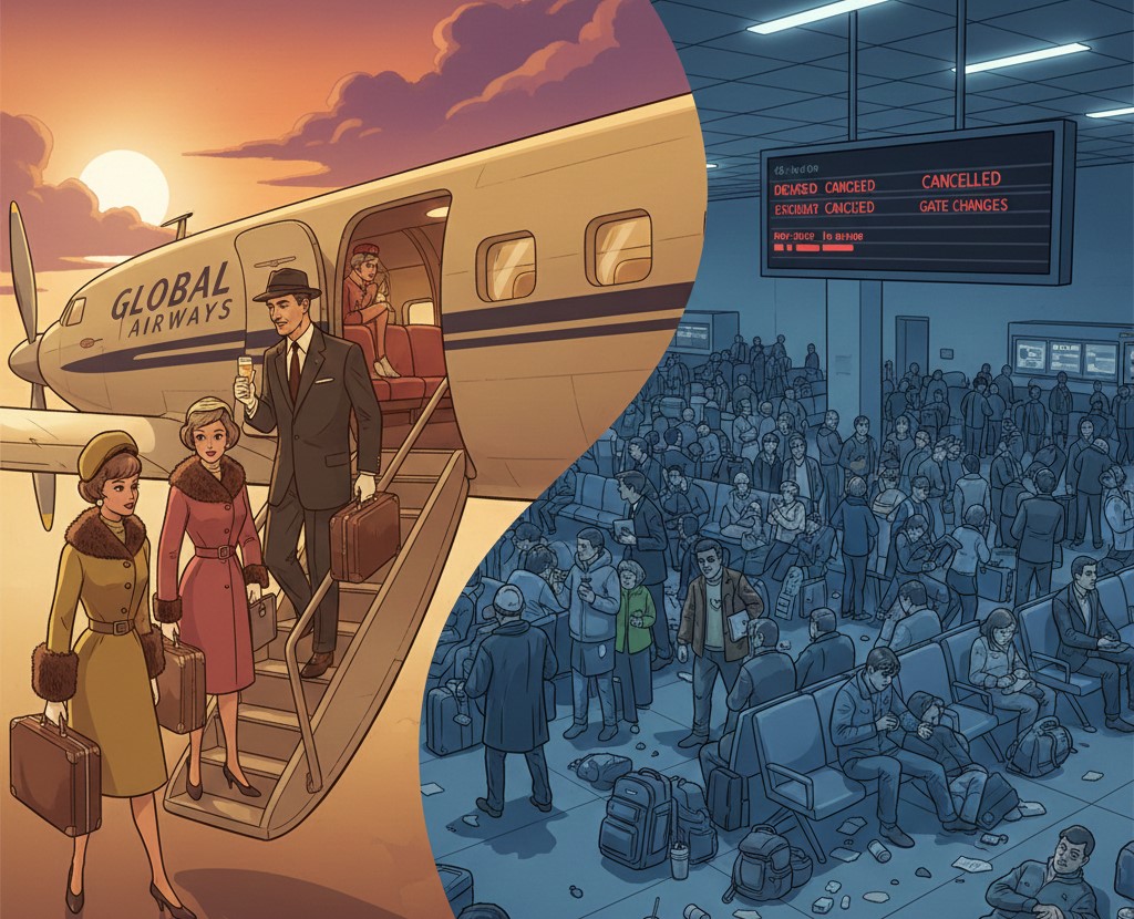 καπνιστήρια μέσα στα αεροπλάνα, αυστηρούς κανόνες εμφάνισης για το πλήρωμα, πολύ συχνότερα ατυχήματα, αλλά και ακριβότερα εισιτήρια που απέκλειαν τους περισσότερους ταξιδιώτες.
