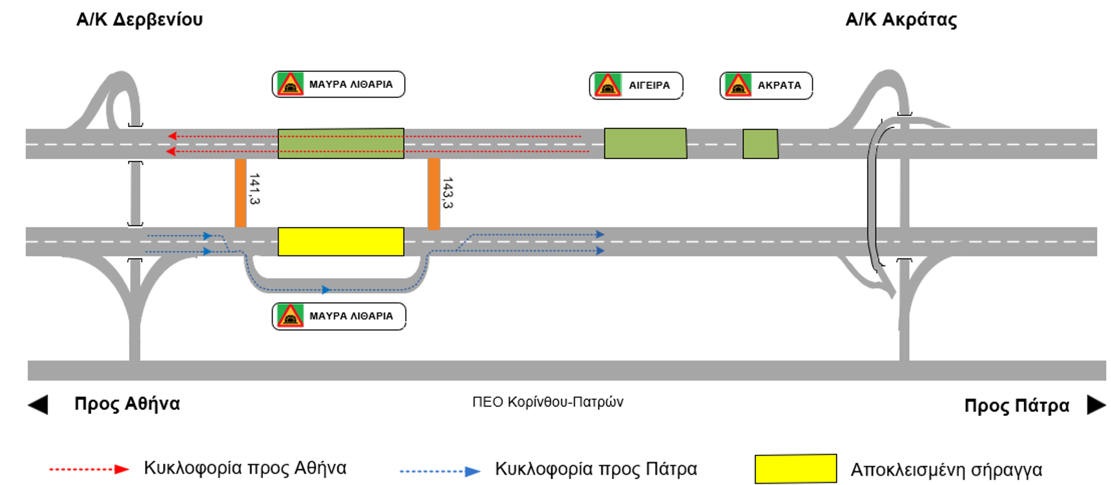 Αποκλεισμός του κλάδου προς Αθήνα και εκτροπή της κυκλοφορίας στον κλάδο κυκλοφορίας προς Πάτρα μέσω των Ανοιγμάτων Έκτακτης Ανάγκης (Α.Ε.Α.) από τη Χ.Θ. 143,30 έως τη Χ.Θ. 141,30. Αποκλεισμός του κλάδου προς Πάτρα και εκτροπή της κυκλοφορίας στην παράπλευρη βοηθητική οδό των σηράγγων, όπως φαίνεται στο ακόλουθο σχηματικό διάγραμμα: