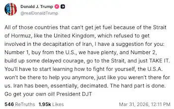 Στο ίδιο πλαίσιο, ο Trump επιτέθηκε και στον Βρετανό πρωθυπουργό Keir Starmer, επικρίνοντας την άρνηση του Λονδίνου να συμμετάσχει στις επιχειρήσεις και συνδέοντας την ενεργειακή πολιτική της χώρας με το υψηλό κόστος.