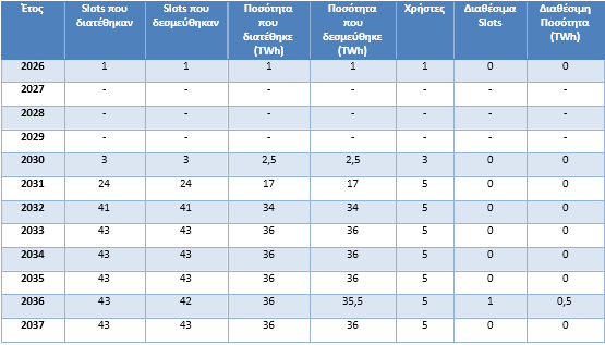 Για τα έτη 2027, 2028 και 2029 τα προσφερόμενα φορτία είχαν ήδη δεσμευθεί πλήρως στο πλαίσιο προηγούμενων δημοπρασιών, ενώ για τα έτη 2026 και 2030 δεσμεύτηκαν τα εναπομείναντα φορτία, οδηγώντας σε πλήρη κάλυψη της προσφερόμενης δυναμικότητας.
