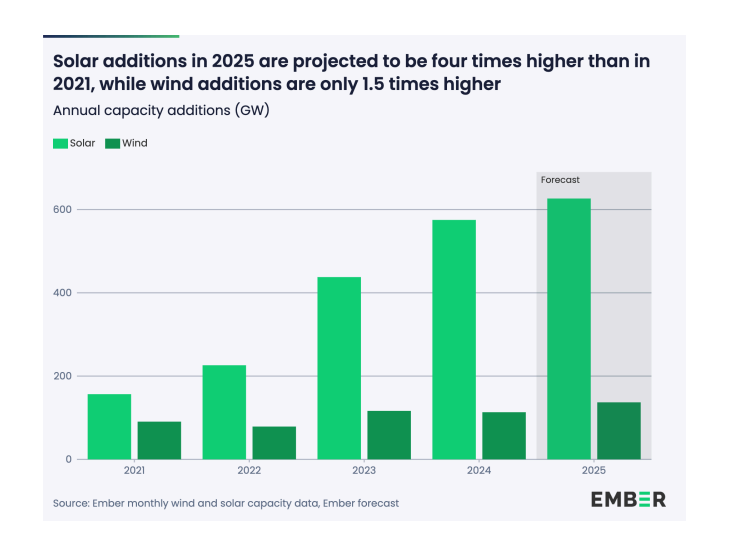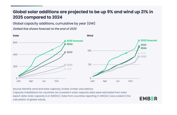 Η Ember προβλέπει αύξηση 11% στις νέες εγκαταστάσεις, φτάνοντας τα 793 GW, από 717 GW το 2024. Η ηλιακή ενέργεια εξακολουθεί να οδηγεί την παγκόσμια ανάπτυξη με άνοδο 9%, ενώ η αιολική αυξάνεται κατά 21%.
