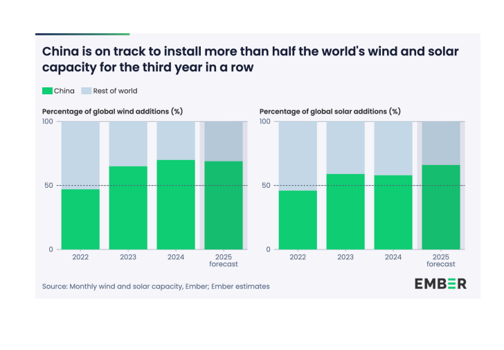 Η Κίνα παραμένει ο κυρίαρχος παίκτης, ευθυνόμενη για το 66% της νέας ηλιακής και το 69% της αιολικής ισχύος του πλανήτη.