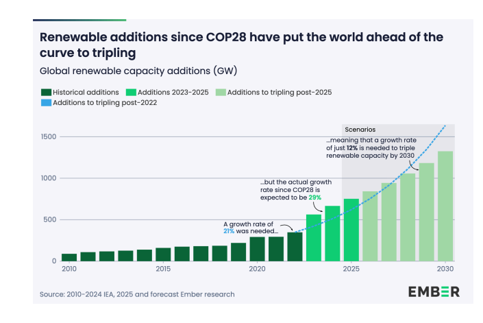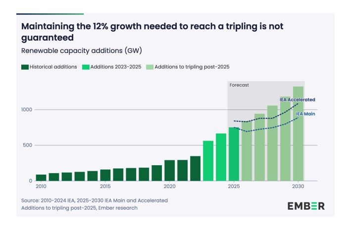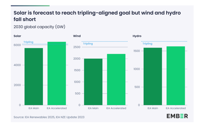 Η Ember συμπεραίνει ότι ο τριπλασιασμός των ΑΠΕ είναι πλέον εφικτός, αρκεί οι κυβερνήσεις να αναβαθμίσουν άμεσα τους εθνικούς στόχους και να επιταχύνουν την εφαρμογή πολιτικών που στηρίζουν την πράσινη μετάβαση.
