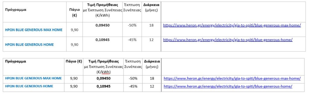 Υπενθυμίζονται οι πολύ ανταγωνιστικές τιμές των σταθερών οικιακών προγραμμάτων HΡΩΝ ΒLUE GENEROUS, με το 18μηνο συμβόλαιο ΗΡΩΝ BLUE GENEROUS MAX να παραμένει κάτω από τα 9,5 λεπτά την κιλοβατώρα, εξασφαλίζοντας χαμηλή & σταθερή τιμή αυτόν, αλλά και τον επόμενο χειμώνα.