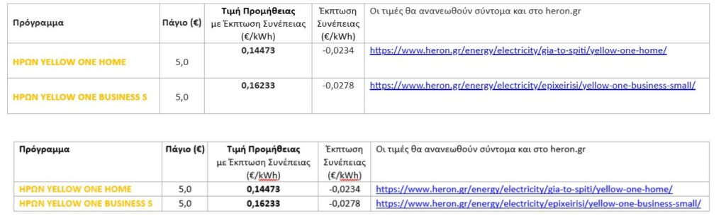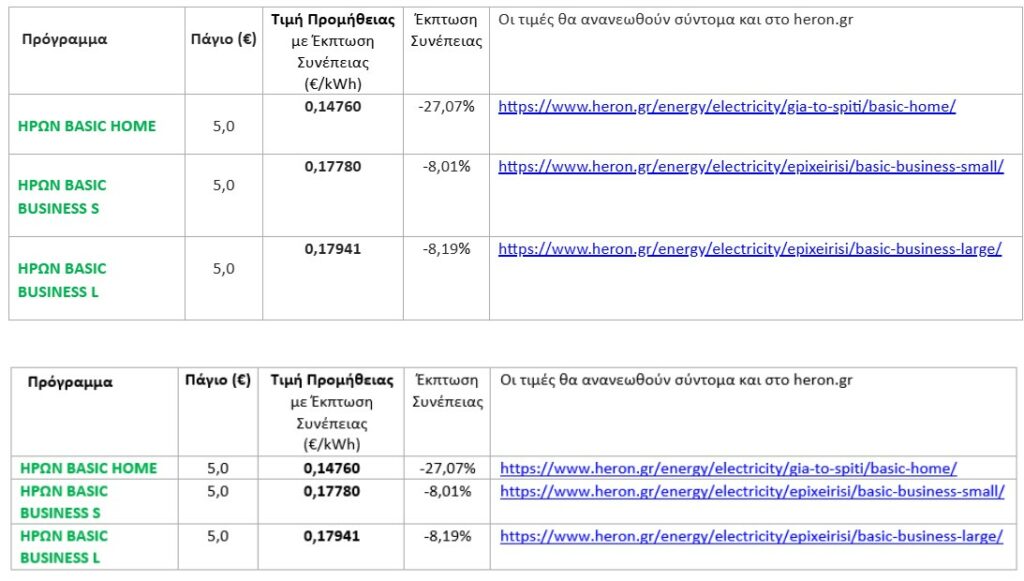 Ο πάροχος, θυγατρική εταιρεία του Ομίλου ΓΕΚ ΤΕΡΝΑ, διατηρεί τις τιμές αμετάβλητες, ίδιες με τις χαμηλές τιμές του Οκτωβρίου και του Νοεμβρίου. Ως εκ τούτου, το «πράσινο τιμολόγιο» του Ήρων αναμένεται να παραμείνει από τα χαμηλότερα της αγοράς.