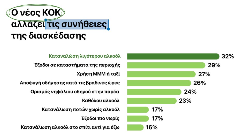 Επιπλέον, κερδίζουν έδαφος οι έξοδοι σε καταστήματα της περιοχής διαμονής (29%), έξοδοι νωρίτερα μέσα στην ημέρα (17%) και συστηματική αποφυγή της οδήγησης κατά τις βραδινές ώρες (26%). Ωστόσο, η αλλαγή των συνηθειών υποστηρίζεται από την εντατικοποίηση των ελέγχων, όπως τα 1,8 εκατομμύρια αλκοτέστ το 2025, τη λειτουργία καμερών στους δρόμους και τους αυξημένους ελέγχους για τη χρήση κράνους.