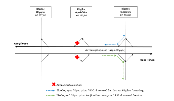 Η κυκλοφορία για το διάστημα αυτό θα εξυπηρετείται από τον γειτονικό κόμβο Γαστούνης (Χ.Θ. 276,86). Δείτε το ακόλουθο σχηματικό διάγραμμα.