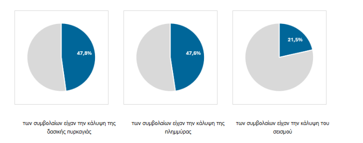 Η κάλυψη για δασική πυρκαγιά και πλημμύρα εμφανίζει σχεδόν ταυτόσημα υψηλά ποσοστά, καθώς το 47,8% και το 47,6% των συμβολαίων αντίστοιχα περιλαμβάνουν τις συγκεκριμένες καλύψεις.