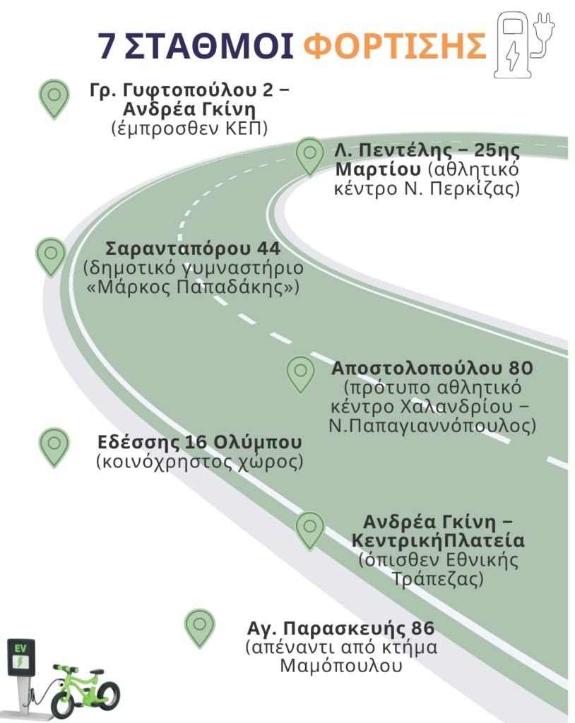 Έχουν εγκατασταθεί 7 σταθμοί στάθμευσης και φόρτισης στα εξής σημεία: