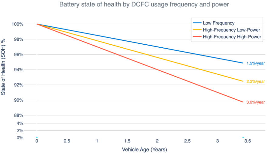 Σύμφωνα με τη μελέτη, ο μέσος ετήσιος ρυθμός υποβάθμισης των μπαταριών ηλεκτρικών οχημάτων είναι 2,3%. Η γρήγορη φόρτιση με συνεχές ρεύμα άνω των 100 kW είναι ο μεγαλύτερος παράγοντας, οδηγώντας σε ρυθμό υποβάθμισης διπλάσιο από ό,τι στην ομάδα φόρτισης χαμηλής ισχύος (3,0% έναντι 1,5% ετησίως).