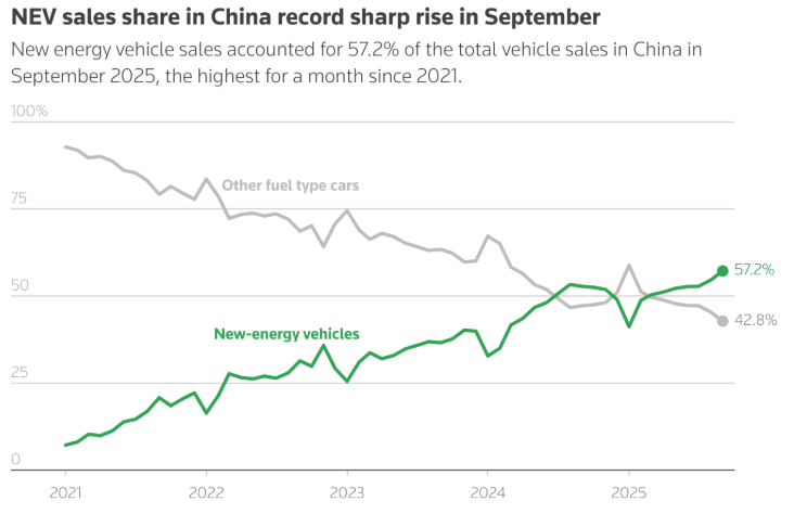 Οι πωλήσεις ηλεκτρικών οχημάτων και υβριδικών αυτοκινήτων αποτελούσαν το 57,2% των συνολικών πωλήσεων και αυξήθηκαν κατά 15,5%, σε σύγκριση με 7,5% τον Αύγουστο.