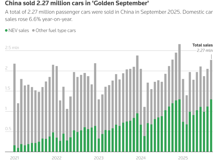 Η αύξηση των πωλήσεων ήρθε επίσης καθώς οι αντιπρόσωποι απέκτησαν περισσότερα αποθέματα τον περασμένο μήνα. Στοιχεία από την Ένωση Αντιπροσώπων Αυτοκινήτων της Κίνας έδειξαν ότι οι αντιπρόσωποι είχαν συνολικά 3,04 εκατ. μονάδες αυτοκινήτων στο απόθεμά τους μέχρι τα τέλη Σεπτεμβρίου, από 2,6 εκατ. πριν από ένα μήνα.