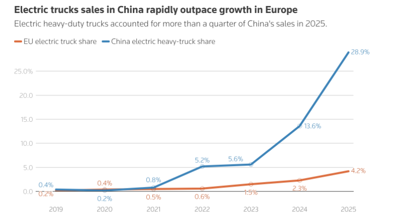 Τα ηλεκτρικά φορτηγά αποτελούσαν το 4,2% των συνολικών πωλήσεων φορτηγών στην ΕΕ το 2025, από 2,3% το 2024. Η ανάπτυξή τους έχει επιβραδυνθεί από τις τιμές που είναι περίπου τριπλάσιες από τον μέσο όρο των 100.000 ευρώ για ένα φορτηγό ντίζελ, σύμφωνα με ειδικούς του κλάδου.