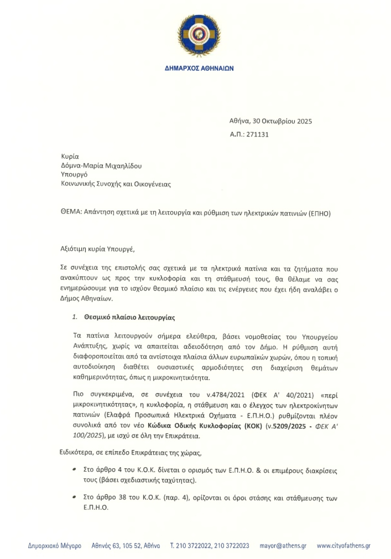 Νέος γύρος σφοδρής αντιπαράθεσης ξέσπασε ανάμεσα στην Υπουργό Κοινωνικής Συνοχής και Οικογένειας, Δόμνα Μιχαηλίδου, και τον Δήμαρχο Αθηναίων, Χάρη Δούκα, με επίκεντρο το χαοτικό τοπίο που επικρατεί στην πρωτεύουσα με την ανεξέλεγκτη κυκλοφορία και στάθμευση των ηλεκτρικών πατινιών. Η δημόσια διαμάχη μέσω επιστολών αναδεικνύει για άλλη μια φορά το «αλαλούμ» και τη σύγχυση αρμοδιοτήτων που διέπει το ζήτημα, με αποτέλεσμα οι πεζοί και κυρίως τα Άτομα με Αναπηρία (ΑμεΑ) να κινδυνεύουν καθημερινά.