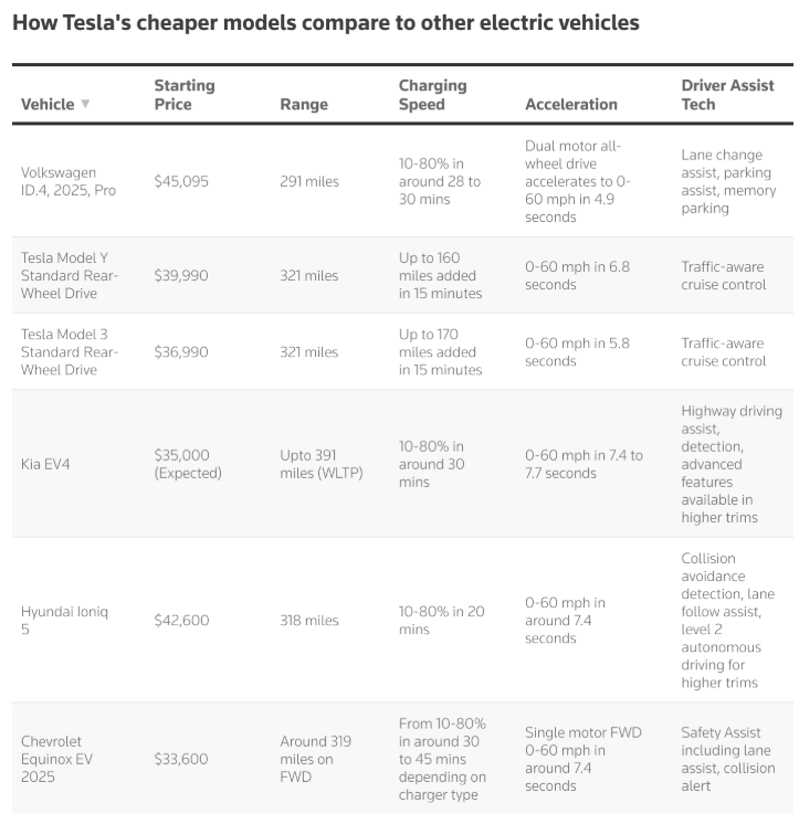 Πιο οικονομικά μοντέλα, όπως το Kia EV4 (35.000 δολ.) και το Chevrolet Equinox EV 2025 (33.600 δολ.), προσφέρουν παρόμοια ή και μεγαλύτερη αυτονομία (391 μίλια το Kia, 319 το Chevrolet), ωστόσο ο χρόνος φόρτισής τους είναι πολύ μεγαλύτερος, αφού για το 10-80% χρειάζονται 30-45 λεπτά, αναλόγως τον τύπο και τη δομή φόρτισης.