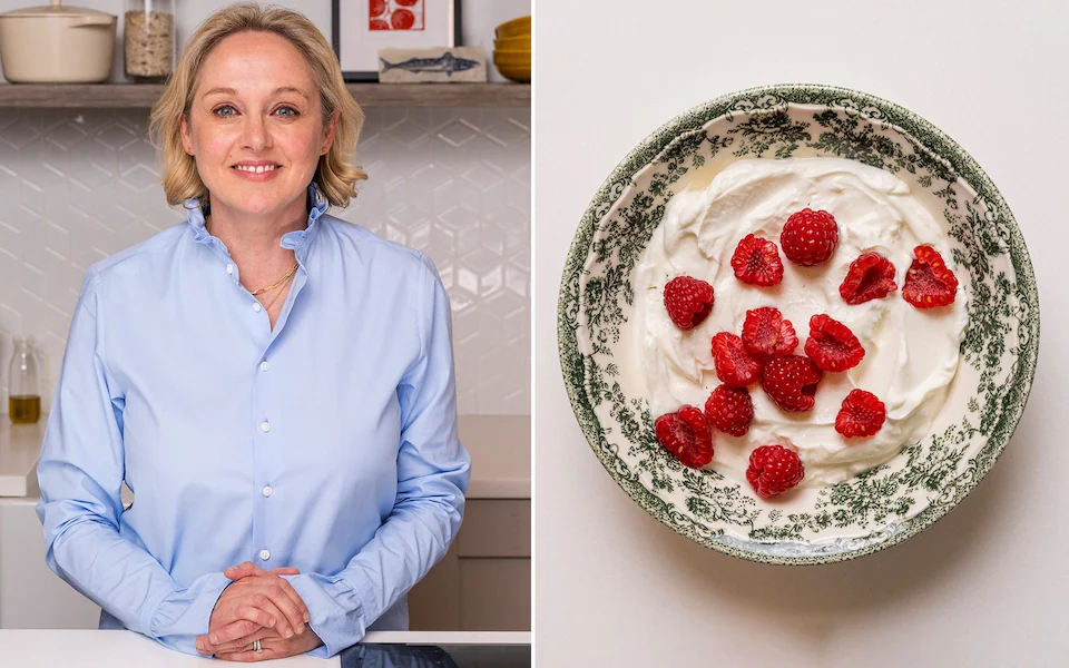 Η διαιτολόγος Sasha Watkins προτείνει γιαούρτι με μούρα ως ένα σνακ πλούσιο σε πρωτεΐνη και προβιοτικά.