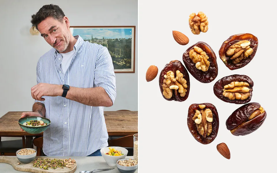 Ο διατροφολόγος Rob Hobson προτείνει χουρμάδες γεμιστούς με καρύδια ως φυσικό σνακ που μπορεί να ικανοποιήσει την επιθυμία για γλυκό.