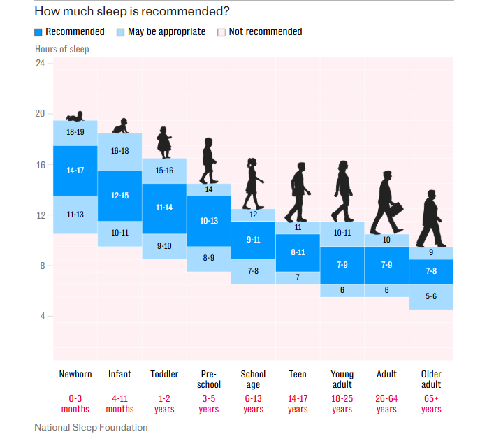 Οι ανάγκες ύπνου δεν είναι ίδιες σε όλη τη διάρκεια της ζωής. Σύμφωνα με τις οδηγίες του National Sleep Foundation, η ποσότητα ύπνου που θεωρείται υγιής αλλάζει σημαντικά από τη βρεφική ηλικία έως τα βαθιά γηρατειά.