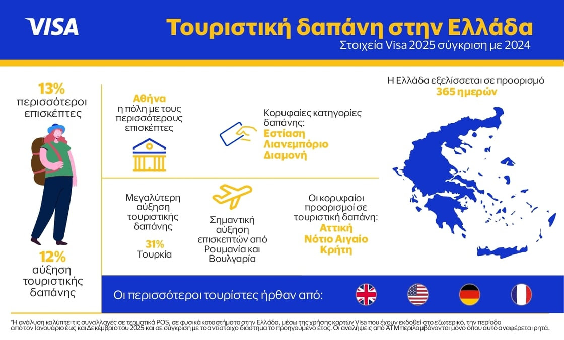 Τα στοιχεία που παρουσιάστηκαν δείχνουν ότι οι δαπάνες σε φυσικά καταστήματα στην Ελλάδα με κάρτες Visa που έχουν εκδοθεί στο εξωτερικό αυξήθηκαν το 2025 κατά 12% σε σύγκριση με το 2024, συνεχίζοντας την ανοδική πορεία των τελευταίων ετών.