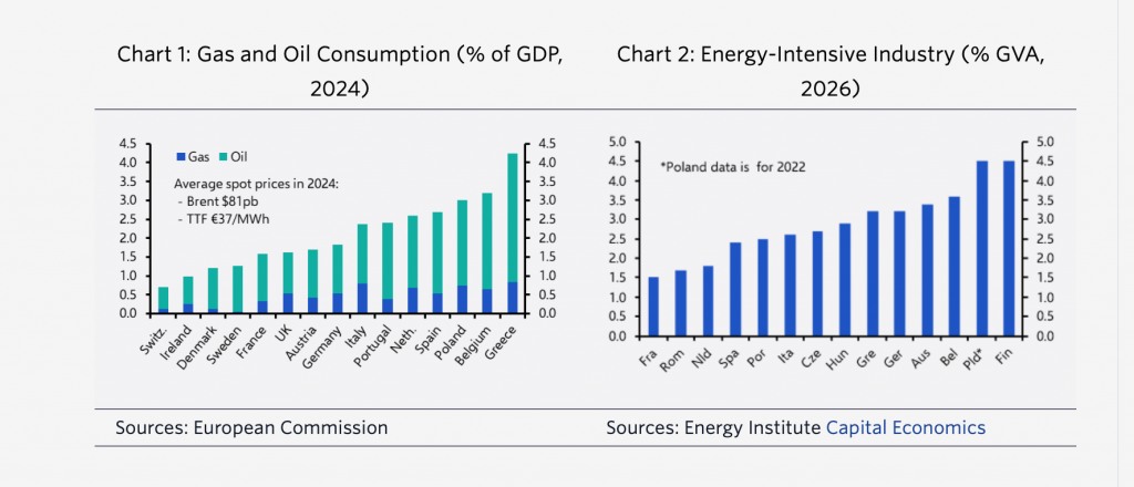 Παράλληλα, η ανάλυση επισημαίνει ότι η χρήση της ενέργειας παίζει εξίσου καθοριστικό ρόλο. Οικονομίες με ισχυρό ενεργοβόρο βιομηχανικό τομέα, όπως η Γερμανία και η Πολωνία, εμφανίζονται ιδιαίτερα ευάλωτες, καθώς η άνοδος του ενεργειακού κόστους μεταφέρεται άμεσα στην παραγωγή. Αντίθετα, χώρες όπως η Ισπανία και η Γαλλία παρουσιάζουν μεγαλύτερη ανθεκτικότητα.