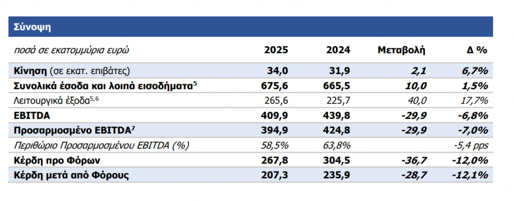 Το Προσαρμοσμένο EBITDA διαμορφώθηκε σε 394,9 εκατ. ευρώ, 7,0% χαμηλότερο σε σύγκριση με το 2024, ενώ το περιθώριο Προσαρμοσμένου EBITDA διαμορφώθηκε σε 58,5%.