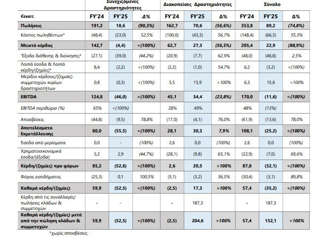Συγκεκριμένα, ο κύκλος εργασιών του Ομίλου στη χρήση 2025 διαμορφώθηκε σε 89,2 εκατ. ευρώ, εκ των οποίων τα 18,6 εκατ. ευρώ προήλθαν από τις συνεχιζόμενες δραστηριότητες, έναντι 353,8 εκατ. ευρώ το 2024, καταγράφοντας μείωση 74,8%.