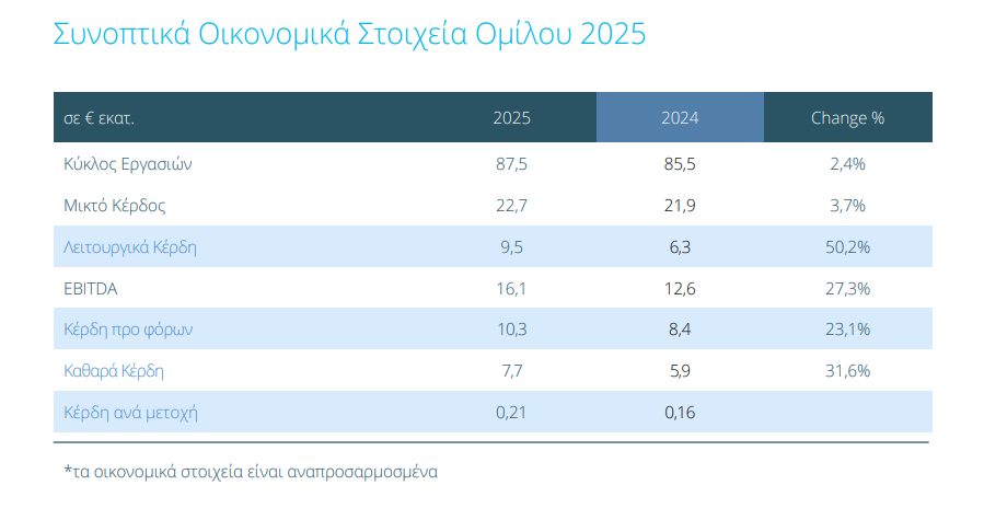 Αύξηση των εσόδων κατά 2,4% στα 87,5 εκατ. ευρώ προερχόμενα κυρίως από την κύρια δραστηριότητα και την αναγνώριση του ΕΔΔΠΧΑ 12, ενώ το EBITDA ενισχύθηκε κατά 27,3% στα 16,1 εκατ. ευρώ, επωφελούμενο από τη μείωση του κόστους ενέργειας κατά 4,2 εκατ. ευρώ. Τα κέρδη προ φόρων ανήλθαν σε 10,3 εκατ. ευρώ (+23,1%), ενώ τα κέρδη ανά μετοχή διαμορφώθηκαν σε 0,21 ευρώ από 0,16 το 2024. Τα ταμειακά διαθέσιμα έφτασαν τα 48,8 εκατ. ευρώ, με την εταιρεία να διατηρεί μηδενικό δανεισμό.