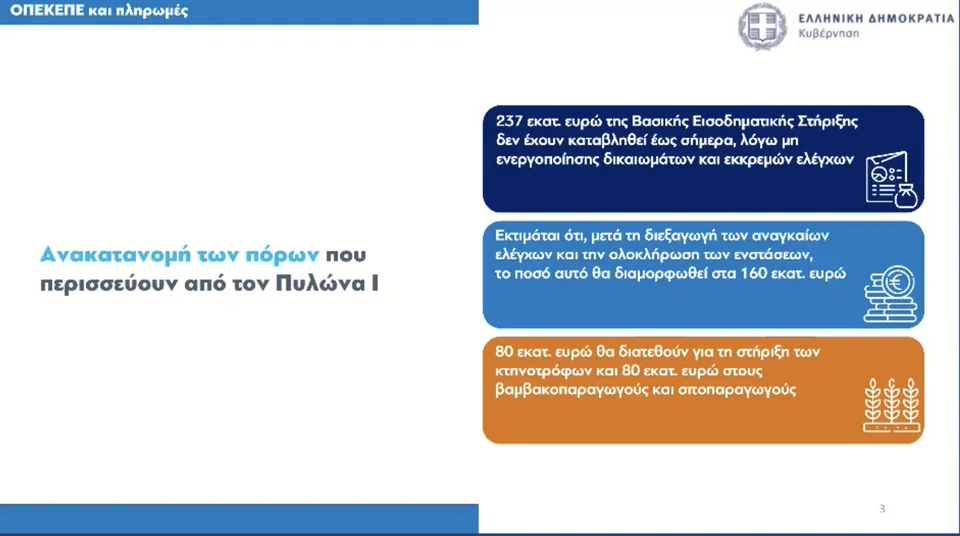 Παράλληλα, προβλέπεται αναδιανομή αδιάθετων πόρων ύψους περίπου 160 εκατ. ευρώ, στοχευμένη στήριξη σε βαμβακοπαραγωγούς, σιτοπαραγωγούς και κτηνοτρόφους, αλλά και ένα ευρύ πακέτο επενδύσεων άνω των 3 δισ. ευρώ στον πρωτογενή τομέα, με έμφαση σε θερμοκήπια, εκσυγχρονισμό εκμεταλλεύσεων, νέους αγρότες και χρηματοδοτικά εργαλεία χαμηλού κόστους.