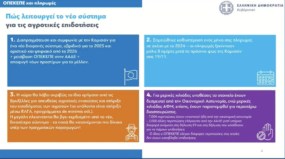 Στη συνέχεια τόνισε, ότι υπήρξε καθυστέρηση ενός μήνα στις αγροτικές πληρωμές σε σχέση με το 2024, οι οποίες ξεκίνησαν φέτος στα τέλη Νοεμβρίου μετά από επιστολή προς την Κομισιόν, διευκρινίζοντας ότι η Ελλάδα λαμβάνει τα ίδια κονδύλια από την ΕΕ για άμεσες ενισχύσεις, ενώ τα επιπλέον ποσά του 2025 προέρχονται από ΕΛΓΑ και άλλα εθνικά μέτρα.