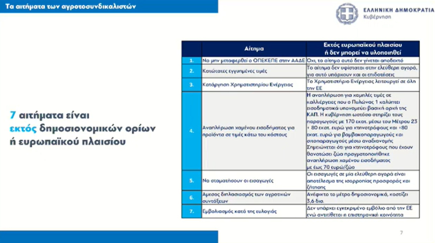Ο ανιτπρόεδρος της κυβέρνησης συνέχισε, αναφέροντας ότι επτά από τα αγροτικά αιτήματα είναι εκτός δημοσιονομικού και ευρωπαϊκού πλαισίου, χαρακτηρίζει βασική μεταρρύθμιση τη μεταφορά του ΟΠΕΚΕΠΕ στην ΑΑΔΕ λόγω αυξημένης αξιοπιστίας με θετική αποδοχή από την Κομισιόν και διευκρινίζει ότι η κατάργηση του Χρηματιστηρίου Ενέργειας δεν είναι εφικτή, καθώς αποτελεί υποχρέωση σε όλες τις χώρες της ΕΕ.