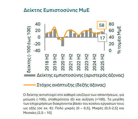 Ωστόσο, διευρύνεται η απόσταση μεταξύ πολύ μικρών και μεγαλύτερων επιχειρήσεων, με τις πολύ μικρές να εμφανίζουν ασθενέστερες προσδοκίες και χαμηλότερη εμπιστοσύνη, γεγονός που αναδεικνύει μεγαλύτερες δυσκολίες προσαρμογής.