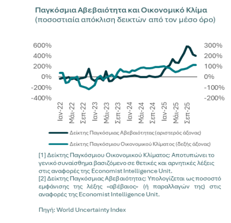Το 2025 ο Δείκτης Παγκόσμιας Αβεβαιότητας εκτινάχθηκε έως και 600% πάνω από τον μακροχρόνιο μέσο όρο. Παρ’ όλα αυτά, οι ελληνικές ΜμΕ διατήρησαν θετικές προσδοκίες, σε ευθυγράμμιση με τη διεθνή τάση.