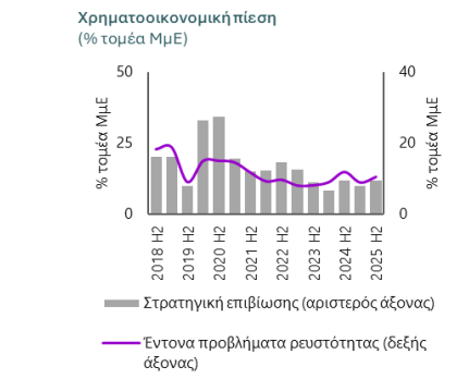 Παρά τις πιέσεις στα περιθώρια οι επιχειρήσεις με έντονη έλλειψη ρευστότητας ή σε κατάσταση επιβίωσης παραμένουν στο 10% (ιστορικό χαμηλό). Η εικόνα αυτή υποδηλώνει ότι το ελληνικό επιχειρείν εισέρχεται στο 2026 με επαρκή περιθώρια αντίδρασης και ενισχυμένη ανθεκτικότητα, στοιχεία που λειτουργούν ως στρατηγικό κεφάλαιο για την οικονομία.