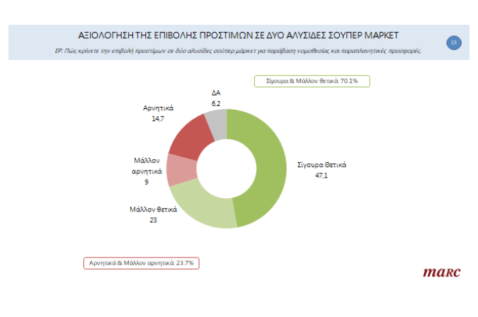 Την έγκρισή τους σχετικά με την επιβολή προστίμων σε σούπερ μάρκετ, όπως και στην πρόθεση του Υπουργείου Ανάπτυξης να προχωρήσει στην ίδρυση νέας ανεξάρτητης Αρχής Προστασίας του Καταναλωτή και εποπτείας της αγοράς, έδωσε η πλειοψηφία των πολιτών, με ποσοστά άνω του 60% και του 70% αντίστοιχα να κρίνουν ως θετικές τις εν λόγω προτάσεις.