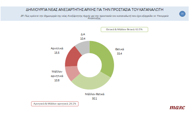 Ως «σίγουρα θετικά» τοποθετείται το 74,1% των ερωτηθέντων και «μάλλον θετικά» δηλώνει το 23%. Θετικοί είναι οι πολίτες και στην ίδρυση της νέας αρχής προστασίας του καταναλωτή και εποπτείας της αγοράς. Ακόμη, κρίνεται «θετικά» και «μάλλον θετικά» από το 33,4% και 30,1% αντίστοιχα.