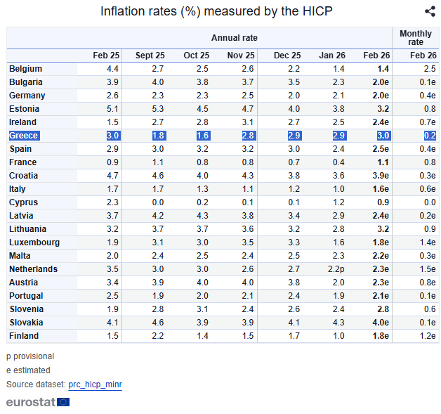 Στο 3% ανέβηκε ο πληθωρισμός στην Ελλάδα τον περασμένο Φεβρουάριο, όπως μεταδίδει η Eurostat, εμφανίζοντας ελαφρά άνοδο συγκριτικά με τον Ιανουάριο (2,9%) και μένοντας σταθερός, όσον αφορά στη σύγκριση με τον αντίστοιχο μήνα του 2025. Σε μηνιαία βάση, οι τιμές καταναλωτή αυξήθηκαν κατά 0,2%.