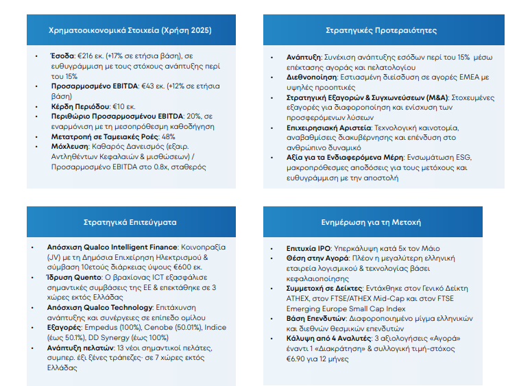 Κατά τη διάρκεια του 2025, ο όμιλος προχώρησε σε μια σειρά από κινήσεις που ενισχύουν τη θέση του στην αγορά. Ξεχωρίζει η κοινοπραξία με τη ΔΕΗ για τη Qualco Intelligent Finance, η οποία συνοδεύεται από σύμβαση 10ετούς διάρκειας ύψους 600 εκατ. ευρώ, επιβεβαιώνοντας τη δυναμική του στον τομέα της χρηματοοικονομικής τεχνολογίας.