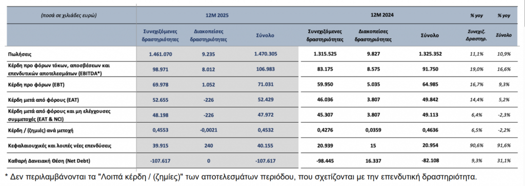 Σε σύγκριση με το 2024, οι πωλήσεις σημείωσαν αύξηση 10,9%, η λειτουργική κερδοφορία (EBITDA) 16,6%, τα κέρδη προ φόρων (ΕΒΤ) 9,3%, τα καθαρά κέρδη μετά από φόρους (ΕAΤ) 5,2%.