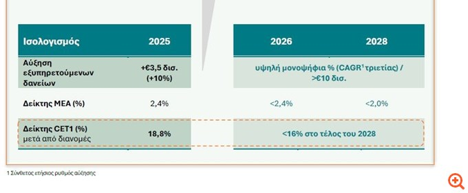 Παράλληλα, οι εκταμιεύσεις δανείων ενισχύθηκαν σημαντικά το Δ’ τρίμηνο 2025 – κατανεμημένες σε πλήθος κλάδων – συντελώντας στην ισχυρή επέκταση των εξυπηρετούμενων δανείων κατά +3,5 δισ. ευρώ ή +10% σε ετήσια βάση το 2025, υπερβαίνοντας σημαντικά τον στόχο πιστωτικής επέκτασης ύψους >2,5 δισ. ευρώ. Οι καταθέσεις ενισχύθηκαν κατά 2 δισ. ευρώ σε ετήσια βάση, αποτυπώνοντας τις συνεχιζόμενες εισροές καταθέσεων όψεως και ταμιευτηρίου, ενώ συνεχίζεται η μετακύλιση προθεσμιακών καταθέσεων προς τα αμοιβαία κεφάλαια της Τράπεζας, βελτιώνοντας περαιτέρω το μείγμα και το κόστος των καταθέσεων.