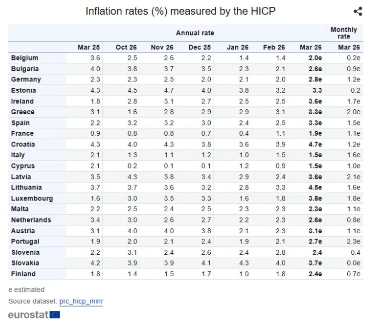 Σύμφωνα με τα ίδια στοιχεία, ο ετήσιος πληθωρισμός στην Ευρωζώνη διαμορφώθηκε σε 2,5% τον Μάρτιο του 2026, από 1,9% τον Φεβρουάριο. Σε μηνιαία βάση ο πληθωρισμός στην ευρωζώνη αυξήθηκε κατά 1,2%. Ο δομικός πληθωρισμός στην Ευρωζώνη (χωρίς να συμπεριλαμβάνονται οι τιμές σε ενέργεια, τρόφιμα, αλκοόλ και καπνό) ανήλθε σε 2,3% και αυξήθηκε κατά 0,8% σε μηνιαία βάση.