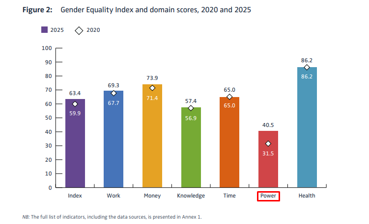 Ο σχετικός δείκτης καταγράφει βαθμολογία μόλις 40,5 μονάδων, γεγονός που υποδηλώνει ότι οι γυναίκες εξακολουθούν να υποεκπροσωπούνται σε κυβερνήσεις, κοινοβούλια, διοικητικά συμβούλια επιχειρήσεων και άλλους θεσμούς εξουσίας.