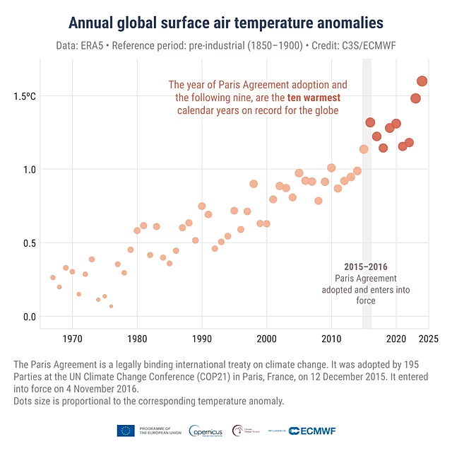 Σύμφωνα με τα στοιχεία των υπηρεσιών Copernicus Climate Change Service (C3S) και Copernicus Atmosphere Monitoring Service (CAMS), η περίοδος 2015–2024 είναι η θερμότερη δεκαετία που έχει καταγραφεί ποτέ.
