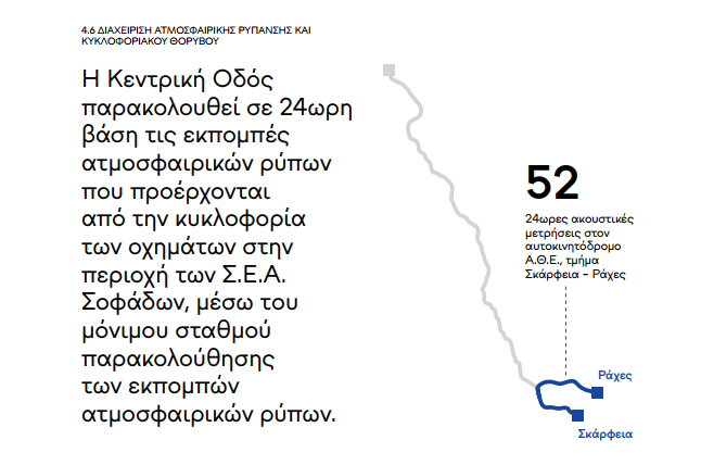 Η ένταση εκπομπών αποτυπώνεται τόσο ανά χιλιόμετρο αυτοκινητοδρόμου (239 χλμ.) όσο και ανά εκατομμύριο οχηματοχιλιόμετρων (428 εκατ. χλμ.), δείχνοντας πώς εξελίσσεται το αποτύπωμα σε σχέση με την πραγματική χρήση του άξονα.