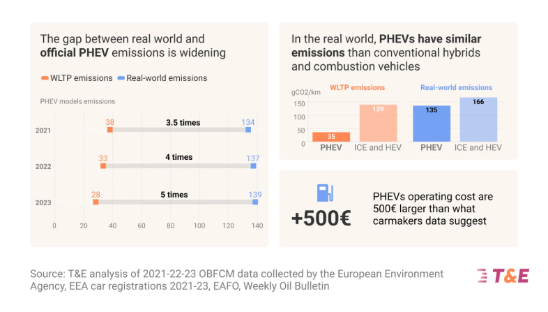 Ωστόσο, σύμφωνα με την μη κερδοσκοπική οργάνωση Transport and Environment (T&E), τα PHEVs εκπέμπουν στην πράξη μόλις 19% λιγότερο CO₂ από τα συμβατικά βενζινοκίνητα και πετρελαιοκίνητα αυτοκίνητα — αντί για 75% λιγότερο, όπως δείχνουν οι εργαστηριακές μετρήσεις.