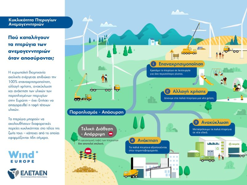 Ένα νέο ενημερωτικό έντυπο για την κυκλικότητα στον αιολικό κλάδο, που εκπονήθηκε σε συνεργασία με τον ευρωπαϊκό φορέα WindEurope και παρουσιάζεται από την ΕΛΕΤΑΕΝ (Ελληνική Επιστημονική Ένωση Αιολικής Ενέργειας), επιχειρεί να δώσει τεκμηριωμένες απαντήσεις. Συγκεντρώνοντας βέλτιστες πρακτικές από όλη την Ευρώπη, χαρτογραφεί πώς τα πτερύγια μπορούν να επαναχρησιμοποιηθούν, να ανακυκλωθούν ή να μετατραπούν σε νέες υποδομές, μετατρέποντας το τέλος ζωής τους σε αφετηρία ενός νέου κύκλου.