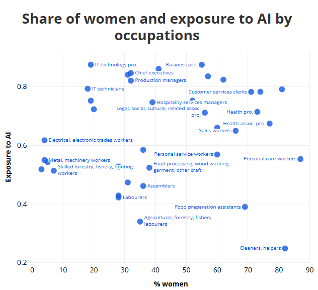 Ωστόσο, οι γυναίκες υποεκπροσωπούνται στα επαγγέλματα με την πολύ υψηλότερη έκθεση στην τεχνητή νοημοσύνη, όπως οι επαγγελματίες της επιστήμης και της μηχανικής και τα διευθυντικά στελέχη.