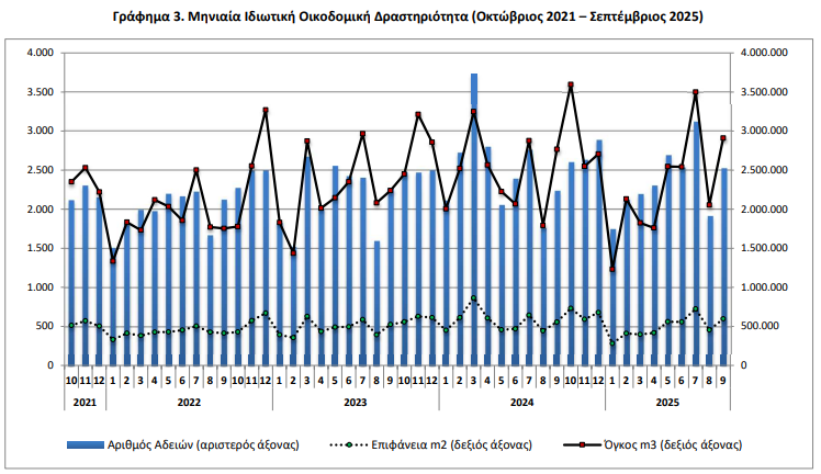 Οι εκδοθείσες άδειες Ιδιωτικής Οικοδομικής Δραστηριότητας, στο σύνολο της Χώρας, κατά τον μήνα Σεπτέμβριο 2025 ανήλθαν σε 2.524 οικοδομικές άδειες, που αντιστοιχούν σε 597.813 m2 επιφάνειας και 2.911.946 m3 όγκου, παρουσιάζοντας αύξηση κατά 12,9% στον αριθμό των οικοδομικών αδειών, αύξηση κατά 7,9% στην επιφάνεια και αύξηση κατά 5,3% στον όγκο, σε σχέση με τον αντίστοιχο μήνα του 2024.