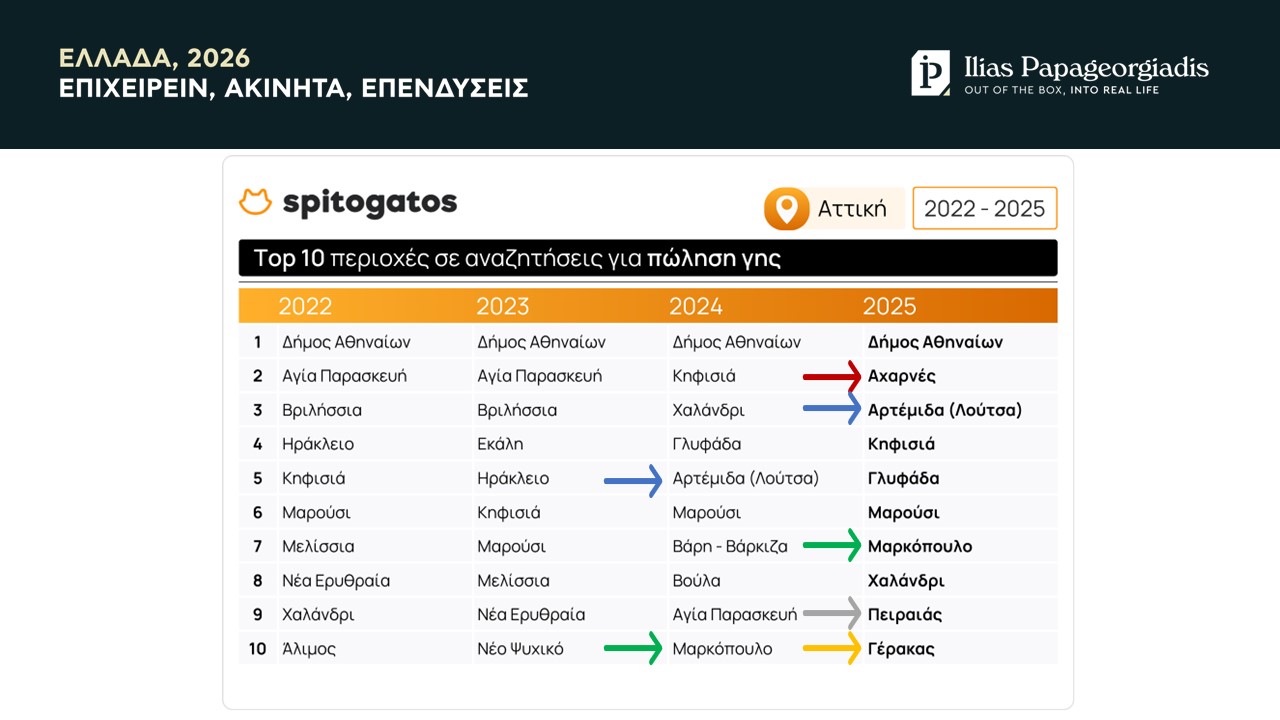 Τα στατιστικά και οι αναλύσεις της πλατφόρμας Spitogatos για τις αναζητήσεις του 2025 αποτυπώνουν καθαρά αυτή τη μετατόπιση: ο Πειραιάς και το Περιστέρι αναδεικνύονται σε νέους πόλους ζήτησης για αγορά και ενοικίαση, ενώ στο μέτωπο της γης ξεχωρίζει η άνοδος της Ανατολικής Αττικής και η θεαματική εμφάνιση των Αχαρνών.