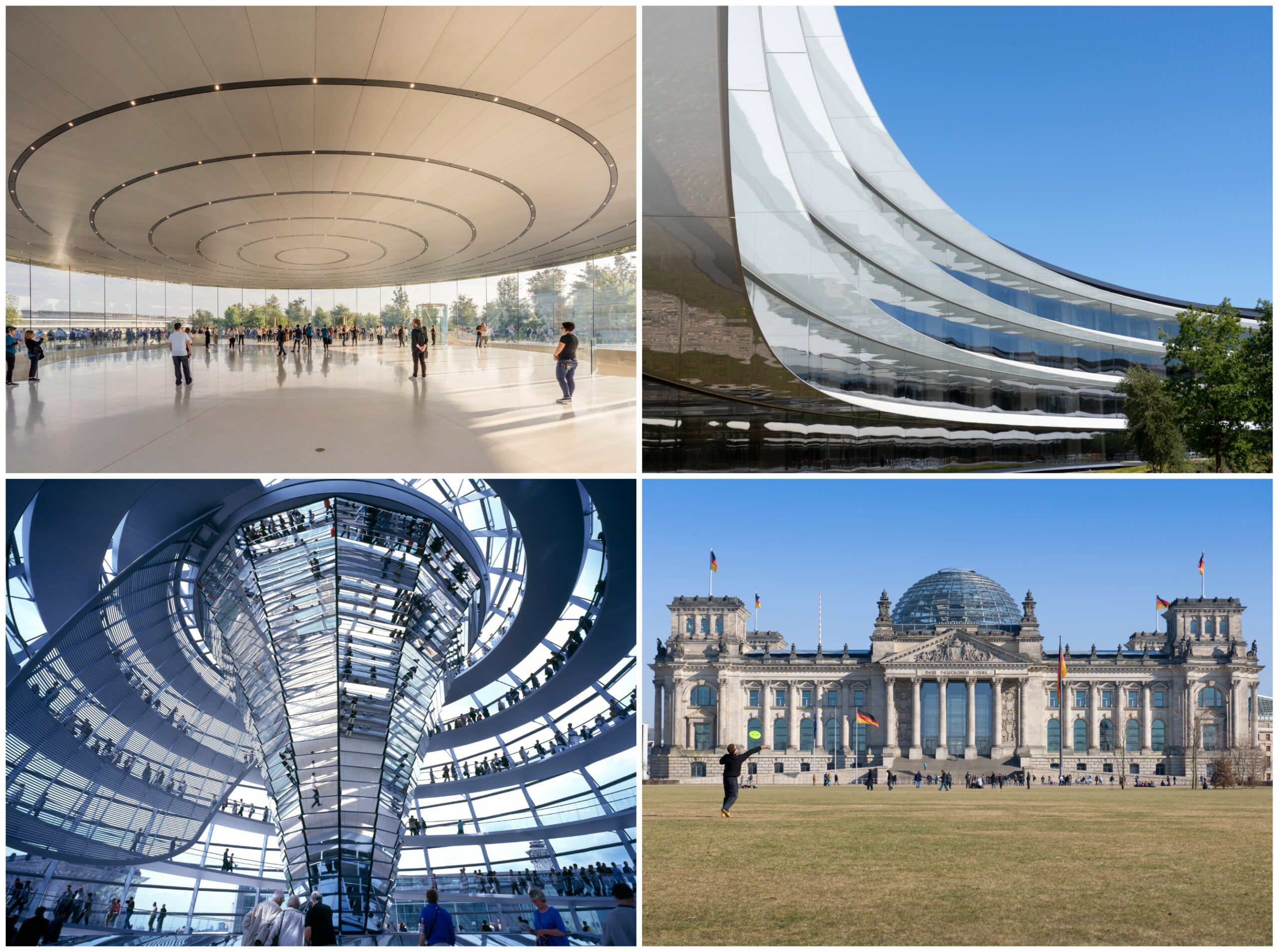 Εικόνες πάνω: Apple Park Καλιφόρνια – Εικόνες κάτω: Γερμανικό Κοινοβούλιο, Βερολίνο (Foster + Partners)