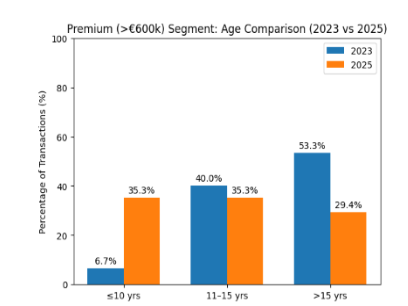 Αντιθέτως, παρατηρείται αύξηση του ποσοστού των αγοραπωλησιών στα νεότερα ακίνητα (έως 10 ετών), τα οποία το 2025 αποτέλεσαν το 35,3% του συνόλου, από μόλις 6,7% το 2023. Από τα στοιχεία αυτά, είναι εμφανής η στροφή των αγοραστών σε νεότερες κατασκευές. Μικρότερη ήταν η μεταβολή στα ακίνητα 11-15 ετών, τα οποία το 2025 προτιμήθηκαν από το 35,3% των αγοραστών, έναντι 40% το 2023.